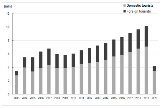 The number of domestic and foreign tourists in Kraków (2003–2020). Source: authors based on [58,71].