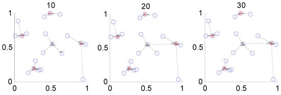 After setting a similarity matrix that emerges from the collection of real valued similarities between every time series pair, the AP clustering is completed and two kinds of messages, responsibility and availability, are updated to select the exemplar points of the clusters. As shown in Figure 1, data points need to cluster, such that AP clustering can automatically divide them into four groups after executing 20 iterations. The exemplar points in red represent the center points of the corresponding clusters. It possesses a representative ability in the related groups to a certain extent. Suppose that several time series are required to be clustered; they are denoted as S = {S1, S2, · · ·, SN}, where S1 is the first time series in the dataset S, and N denotes the total number of time series considered.