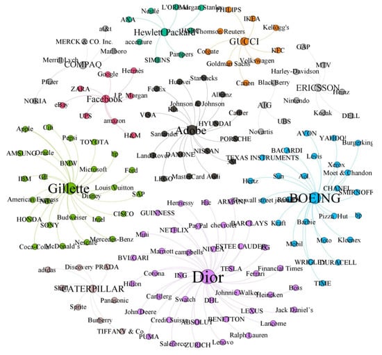 The Gephi software was used to show the clustering results via visualization tools. The grouping results are first shown in Figure 2, where each brand connects to the exemplar brand in a group. Distances between two brands can be denoted by curved lines, and these curved lines emoted from an exemplar and were connected with its corresponding brands. In Figure 3, the details of each group’s trend and hierarchical clustering were summarized. There are 11 exemplars (groups), such that the exemplar brands and the number of brands belonging to each group (dubbed as “account number”) are as follows: V1—Facebook (9), V2—Gillette (27), V3—GUCCI (10), V4—Adobe (19), V5—Hewlett Packard (9), V6—Caterpillar (9), V7—Compaq (7), V8—AIG (4), V9—Boeing (26), V10—Ericsson (8), and V11—Dior (40).