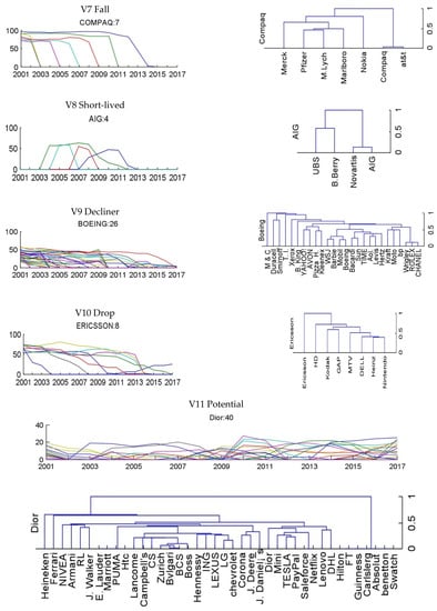 As shown in Figure 3, the brands’ evolution trends clustered by their ranking value for each group can be observed. They share the same evolution trend due to similarity between each brand and its exemplar in a group. Each group was given a name according to their evolution trends, such as V1—Fast riser, V2—Top tier, V3—Stable, V4—Slow grower, V5—Sudden entrant, V6—Unstable, V7—Fall, V8—Short lived, V9—Decline, V10—Drop, and V11—Potential, as shown in Table 3. From Figure 3, we can also observe the level of similarity for each pair of brands: a short distance between two brands implies that their trends are highly similar.