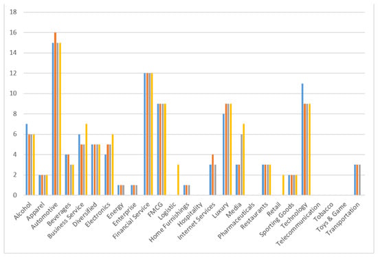 Table 5 and Figure 4 show the industrial composition of Interbrand’s Best Global Brands from 2017 to 2020. The automotive, financial service, technology, luxury, and FMCG sectors were identified as the major international brand sectors. Business service, media, and internet services, such as technology, were observed to be the growing sectors.