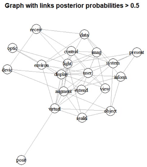 In the Bayesian visualization with low and high posterior probabilities, we can see that the keywords of user, display, image and virtual have highly ranked connections. In addition, we found that the keyword of system is meaningful in the result with posterior probability > 0.5, and data is an influential keyword in the result with posterior probability > 0.9. Next, to find the technological structure based on higher ranked keywords, we carried out Bayesian visualization using top 20 and 10 keywords related to XR technology. Figure 5 provides the Bayesian visualization results of top 20 keywords by posterior probabilities with larger than 0.5 and 0.9.