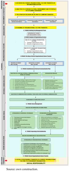 For organizations that operate on a multinational level and are forced by strategic reasons to spread their business to subsidiary organizations in foreign cultural environments, transfer of organizational know-how concerning the operation in the period of organizational change started to play an important role [,,,,,,]. The organizations do not know which exact socially responsible impact is going to have the transfer of parent organization culture to the subsidiary organization in a foreign cultural environment—nor they know if the parent organization culture will be in line with organizational sustainability, which includes a group of actions taken to meet the needs of the present moment while committing to future capacity without any negative impact on the environment and social responsibility, which are elemental ingredients of the sustainability concept [].