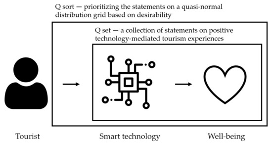 Q-methodology is an exploratory research method often used by researchers to probe into the attitude of people about an interest [40], and findings from Q aim to offer a gestalt view about people’s subjective opinion on a particular topic. Conducting Q involves five steps. The first step involves defining the discourse of investigation. To this end, the researchers aimed to know participants’ attitudes and opinions on how technology can be used to enrich their tourism experiences for their sustainable well-being. The more layman term “enrich” was used to elicit their desire regarding these well-being attributes in relation to the opinion statements. In the second step, a collection of opinion statements (known as Q set in Figure 1) were generated with reference to current literature. These statements covered different dimensions of technology-mediated positive tourism experiences. Also, statements on potential barriers (i.e., risk and trust) that users may encounter in technology adoption were included. Then, a group of potential users were invited to sort and rank the Q set from their perspectives on a quasinormal distribution grid and subsequently interviewed on the choices made (known as Q sort in Figure 1). Lastly, factor analysis was conducted on the dataset collected and identified factors were interpreted. Insights found in these factors provide practical direction for further design development. Figure 1 shows the research framework for this study.