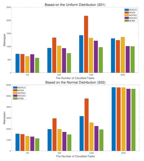 Figure 3 shows that as in a uniform distributed environment, it can be seen that the green color represents different values of MOBA under different conditions of cloudlets’ values, and its makespan is always lower than the other several meta-heuristic algorithms. Especially when the cloudlet is 1000, the value is much lower than MOGA represented by orange. And under the normal distribution, when the cloudlet’s values are 100 and 2000, the degree of change of all algorithms is small. While the values are 500 and 1000, the makespan of MOGA is the longest, the makespan of MOBA proposed in this paper is the best. It shows that in these two distributions, MOBA has better effectiveness and superiority.
