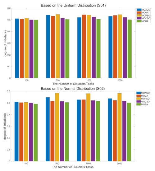 Figure 4 shows that in the case of uniform distribution, similar to Table 5, the value of its cloudlet fluctuates very little, which also reflects the performance of examining the degree of imbalance. The change under uniform distribution is not as strong as the normal distribution. In a normal distribution environment, it can be analyzed that MOPSO has the worst imbalance. Moreover, the degree of imbalance of MOBA is the best, and the results of MOCSO are comparable to those of MOBA.