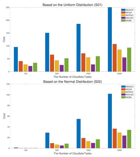 As it is a cost calculation, the smaller the result, the better. It can be observed from Table 8 that in uniform distribution and normal distribution, as the number and scale of the cloudlets increase, the cost of all algorithms also increases. It can be seen from the standard deviation that MOBA is generally smaller than the standard deviation of MOACO, MOGA, and MOPSO, and larger than the standard deviation of MOCSO. It can also be obtained that the cost of MOACO is the highest, while the cost of MOCSO is the lowest.