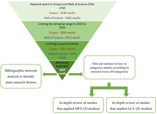 This systematic literature review is based on an extensive search in two selected research databases, Scopus and Web of Science, by using a keyword search. These two databases were selected for the literature search due to their size, coverage, and relevance in the subject field. Peer-reviewed journal articles published after 2010 that had the keywords “e-waste”, “electronic waste”, “Waste Electronic and Electrical Equipment”, “WEEE”, “End of life electronics”, “Waste electronics”, and “In use stocks of electronics” in the title were filtered out from both databases. Since the selected keywords covered all possible uses of ‘e-waste’, it was assumed that, if a study was mainly focused on e-waste, one of these keywords must appear in their title. Web of Science identified 1478 articles whereas Scopus identified 1824 studies. After removing the duplicates, 1835 peer-reviewed journal articles were selected for the desk review. This step-by-step filtering process is summarized in Figure 1. The selected 1835 studies were first projected to a bibliographic network analysis for understanding the most and least frequently researched areas in WEEE literature. Secondly, a more in-depth review was conducted to explore the application of MFA and LCA in WEEE research.
