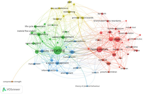 The biggest cluster is the one that is shown in red in Figure 3, with 29 items containing keywords related to environmental and human health exposure, mostly due to toxic chemicals found in e-waste (e.g., heavy metals, PCBs, PBDEs, soil, lead, human exposure, dust, etc.). This indicates that a larger proportion of e-waste literature concerns the negative health and environmental impacts associated with e-waste. The second largest cluster contains 15 items and is shown in green (Figure 3, middle left) in the keyword map. In addition to the keyword ‘recycling’ which is centered in this cluster but connected to all other clusters, a few other keywords such as ‘circular economy’, ‘waste management’, ‘reverse logistics’, ‘life-cycle assessment’, and ‘material flow analysis’ take prominence in this cluster. This second cluster appears to represent research that links the recycling of e-waste to the industrial ecology aspects, such as MFA and LCA. Moreover, the circular economy, which has recently received a lot of momentum across governments, industry, and academia, is appearing as a distinct node in this cluster. When the network map was adjusted to illustrate the temporal distribution, it was distinctively observed that the circular economy has appeared in e-waste research only over the last few years, and also that a larger fraction of the most recent publications on e-waste has been related to the circular economy (e.g., [19,31,44,45,46,47,48,49]). This indicates that, similarly to the growth of circular economy research in general, its application in e-waste is also on the rise. The third cluster shown in blue (bottom left) includes literature related to e-waste management in general, consisting of keywords ‘sustainability, ‘e-waste management’, ‘informal sector,’, ‘China’, ‘India’, and ‘legislations’. The fourth cluster shown in yellow (top) contains keywords related to material recovery, indicating that the recovery of precious metals and rare earth elements using technologies such as bioleaching and hydrometallurgy is also an emerging branch of research in e-waste literature. Thus, to summarize, this analysis has identified four main branches of research in e-waste literature, namely, environmental and human health implications, general management of e-waste and related policies, recycling and reuse for material circularity, and recovery of precious metals and REEs.