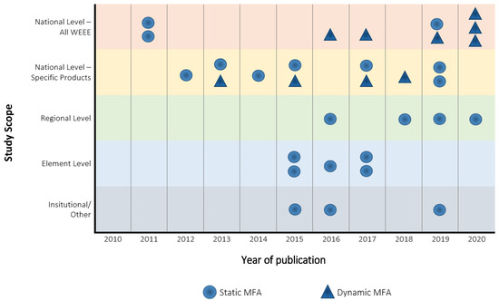 Overview of WEEE research that utilized MFA as a tool from 2010 onwards (Each circle/triangle stands for an individual study; shape denotes if the MFA used a static model or a dynamic model).