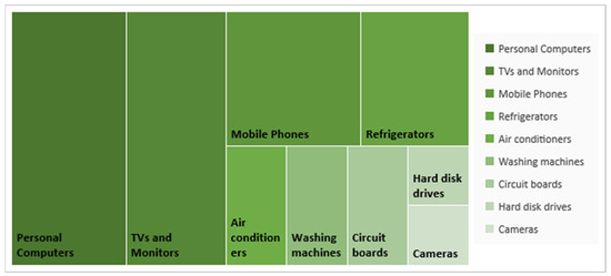 Electronic waste, or e-waste, refers to “all items of electronic and electrical equipment and its parts that have been discarded by its owner as waste without the intent of re-use” (Step Initiative, 2014; p. 4). E-waste is also referred to as waste electronics, e-scrap, end-of-life (EoL) electronics, or more often as waste electrical and electronic equipment (WEEE). There is a large variety of EEE products on the market with different material compositions, functions, lifetimes, and end-of-life attributes, making it essential to have a sensible and practically useful categorization for grouping EEE [8]. The WEEE Directive [9], enforced in the European Union (EU) member countries, initially listed 10 categories for which data should be collected: (1) Large household appliances; (2) small household appliances; (3) IT and telecommunication equipment; (4) consumer equipment; (5) lighting equipment; (6) electrical and electronic tools; (7) toys, leisure, and sports equipment; (8) medical devices; (9) monitoring and control instruments; and (10) automatic dispensers. During the recast in 2018, the WEEE Directive listed the following six categories that should be reported from 15 August 2018, which is the categorization currently in use [2,8].