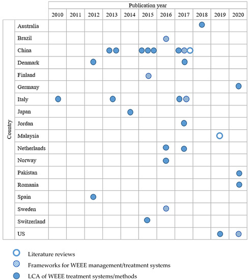 Since the application of LCA in WEEE management notably varied from one study to another, with the aim of presenting a clear understanding, this review categorized the selected articles into three broad categories, i.e., (1) Literature reviews, (2) Methodological frameworks for WEEE management, and (3) LCA of WEEE treatment methods/systems. The first category contains articles that presented systematic literature reviews of e-waste-related LCA studies. The second category includes studies that have presented novel methodological frameworks, models, and approaches for e-waste management using a life cycle approach. These studies may not have conducted a conventional LCA of WEEE product/products, but rather utilized the LCA tool to develop a management approach or a process. The studies that have conducted an LCA for selected WEEE product systems, treatment methods, or material recovery processes are included in the third category of the above classification. Categorization of the selected articles according to the published year, country, and the type of study is illustrated in Figure 6 below.
