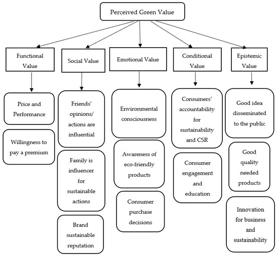 PGV is defined as consumers’ overall evaluation and appraisal of products in regards to their perceived environmental and sustainable advantages [20,24,25]. This concept derives from consumer perceived value (CPV) theory, which mainly considers two dimensions, which are the functional value (quality, services, price, and convenience values) and the symbolic value (aesthetic, emotional, social, and reputational values) [26]. It was previously found that consumers who value sustainability are more willing to purchase environmentally friendly products [27]. PGV is a five-dimensional framework initially proposed by Sheth et al. [28] that includes (1) functional, (2) social, (3) emotional, (4) conditional, and (5) epistemic values used to analyze consumer purchase intention toward environmentally friendly purchases. These five dimensions were found to influence consumers’ sustainable shopping behaviors in previous studies [20,29,30,31], which demonstrates that PGV is an ideal framework for investigating which values are driving U.S. millennial’s willingness to shop recycled polyester-made athleisure apparel.
