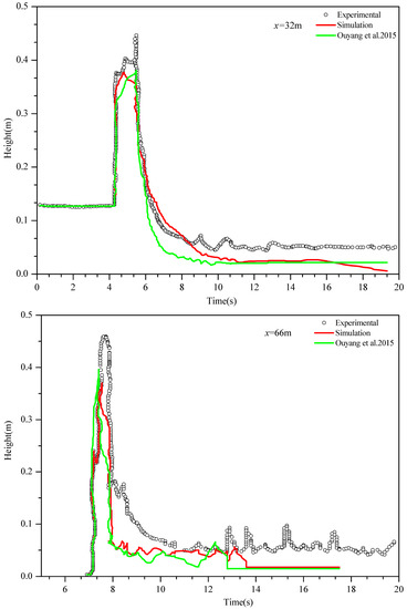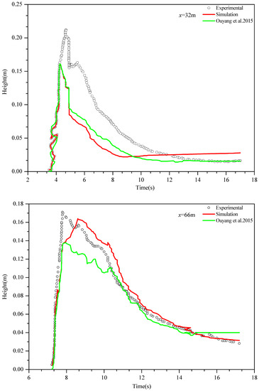 Figure 2 and Figure 3 show a comparison between the numerical solutions and the experimental results of the flow height–time curves of rough bare bed and erodible sediments. The experimental curve in Figure 3 corresponds to experiment C by Iverson [45]. Additionally, the results are close to those of the simulation in [38]. The simulation curve of the water flow height with time is basically consistent with the experimental results. For the erodible channel bed, the time to reach two positions is slightly earlier than the experimental results. Therefore, this simple model with a constant pore pressure coefficient can capture complex debonding flow dynamics [45]. The results show that the model established in this paper can be used for debris flow simulations.