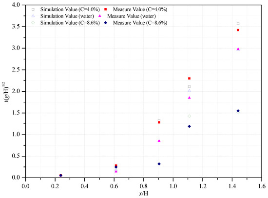 Dam-break flows are caused by a mixture being released by the reservoir located upstream of the flume. The discharge caused by the sudden removal of gates between reservoirs and rivers is actually instantaneous. The propagating positive waves were captured by cameras. The velocity of the wave and the form of the wave array were digitally recorded. In each experimental process, the level was also continuously monitored. The initial reservoir depth was 10–30 cm, the channel bed slope was 0.0–0.1%, and the volume concentration was different. The channel slope was 0.1%. The wavefront propagation time increased significantly as the concentration increased. For different concentrations, the simulated and observed values are basically consistent, and it is clear that the model is reliable (Figure 4).