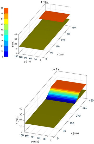 The general process of the dam-breaking debris flow is that the water flow is fully topped, then the dam body is flattened, and finally, the entire body is broken to form a debris flow. To verify the rationality of the proposed GAST model, the experiment performed by Komatina in 1997 [46] was selected as an example. This experiment has been used by many scholars to verify numerical models that simulate dam-break debris flows. The length of the water tank in the calculation example was 4.5 m, and the width was 1.5 m. The fluid was a mixture of water and kaolinite clay with solid particles of different concentrations. The average diameter of the particles was 0.006 mm. The proportion of clay material was 2.65. The dam-breaking debris flow was simulated at different moments in the smooth flume. The measured slurry was placed in a container with a length of 2 m and a width of 1.5 m at the top of the water tank, with an initial height of 1 m, and the slurry was blocked by a movable baffle.