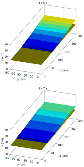 In Figure 7, a resting velocity of 0 m/s can be observed at t = 0 s. As the sliding speed increased, the velocity accumulation peaked at t = 5 s, with the speed reaching 12 cm/s, and the corresponding horizontal distance was 40 cm. As the debris flow moved in the horizontal direction, the mud depth showed a tendency to fluctuate and thicken—that is, there was a possibility of accumulation—additionally, the area of the debris flow was approximately 330 m2. At t = 15 s, the debris flow eroded the channel bed and moved to the end of the flume. The slope of the breach continued to slide, which made the breach wider than it was at t = 7 s. The velocity was mostly between 10 cm/s and 5.5 cm/s, and the maximum velocity was 17.5 cm/s.