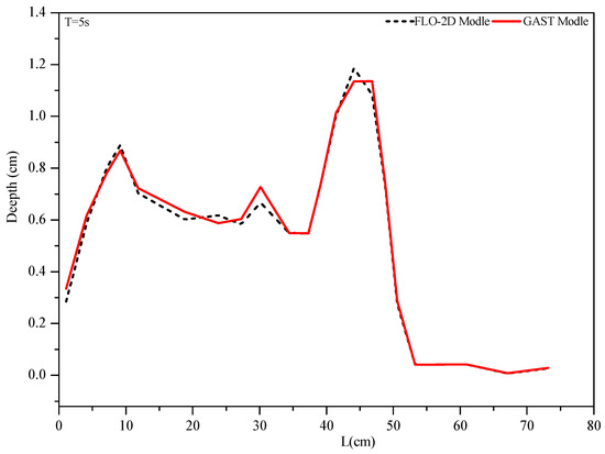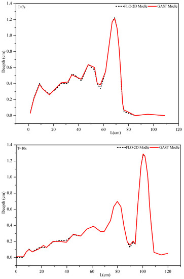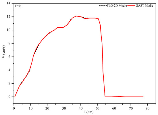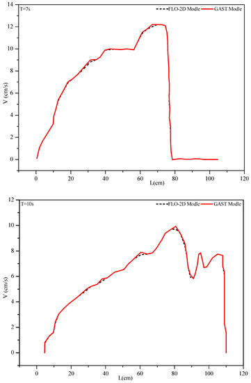 The FLO-2D model is a tool adopted worldwide for the simulation of debris flow phenomena and hydraulic flooding of urban areas [47,48]. At present, the FLO-2D model has possibly been most widely applied to natural debris flows or compared with other models [49,50,51,52]. In order to verify the simulation results of the GAST model, this paper compares the simulation results with those of the FLO-2D model by simulating the sliding phenomenon at different stages. It was found that the simulated horizontal distance and debris flow velocity were basically consistent with the actual physical process. This verifies the rationality of the GAST numerical model in this paper.