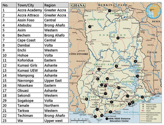 - Ministry of Education. Ministry of Education Report: Distance Education Workshop; Government of Ghana: Accra, Ghana, 2002. [Google Scholar]