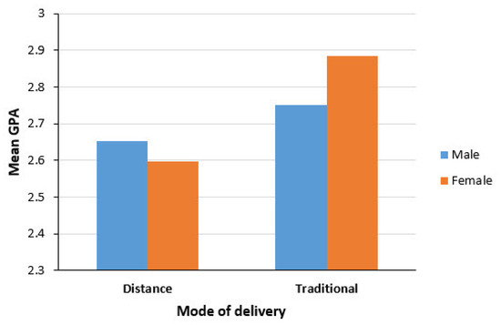 It has been determined that male graduates performed better than the female graduates in the distance program. On the contrary, female graduates performed better than male graduates in the traditional face-to-face program. This finding is consistent with a study by [30], which reveals that in general, female students perform poorer than male students in distance education programs.