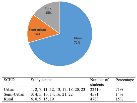 Factorial ANOVA with post hoc analysis was used to investigate the extent to which gender and study center economic demography (SCED) affect the academic performance of distance education students. The SCED was adapted and modified from the Ghana statistical service population and housing census [36]. The study centers are grouped under Urban, Semi-Urban and Rural. Study centers located in regional capitals are classified as Urban, study centers in localities with 50,000 or more persons which are not Urban are classified as Semi-Urban, while study centers in localities with less than 50,000 persons are classified as Rural. In all, ten study centers are classified as Urban, nine are classified as Semi-Urban and five are classified as Rural. From this classification, 22,410 (71.0%) of the distance education students are from Urban study centers, 4581 (14.0%) are from Semi-Urban study centers and 4743 (15.0%) are from Rural study centers (see Figure 4).