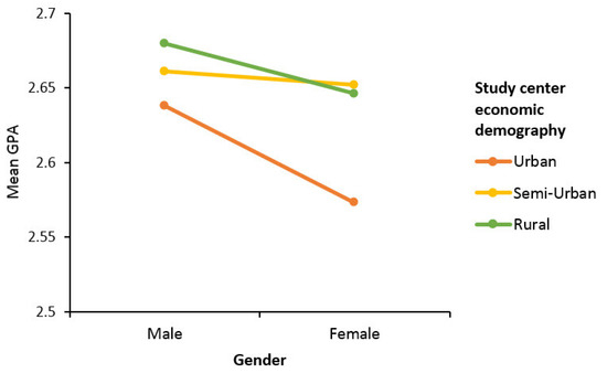 The Post Hoc analysis (see Table 9) reveals that there is a significant difference in the mean GPA scores of male students from Urban study centers as compared to male students from Semi-Urban () and Rural () study centers. Considering the mean GPA scores, this finding indicates that male students form Rural study centers performed better than male students from Urban and Semi-Urban study centers. A significant difference is also found between the mean GPA of females from Urban study centers as compared to female students from Semi-Urban () and Rural () centers. A look at the means shows that female students from Rural study centers performed better that those from Urban study centers. Female students from Semi-Urban centers had the highest mean cumulative GPA scores, but their scores were not significantly different from those of female students from Rural study centers (), as shown in Figure 5.