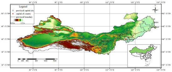 The Three-North region (73°26′ E–127°50′ E, 33°30′ E–50°12′ E) is located in the ecologically fragile area of China including the western part of northeastern China, northern China and most of the northwestern region, as shown in Figure 1. This region covers 551 counties in 13 provinces, covering an area of more than 4 million square kilometers, accounting for 42.4% of the country’s total land area. The climates of the Three-North region are quite different, including arid climate, semiarid climate, and semiarid and semihumid climate. Arid and semiarid regions account for two-thirds of the Three-North region. From the northeast end to the southwest section, the average temperature ranges from −2 °C to 14 °C, and the temperature in most areas ranges from 2 °C to 5 °C. The precipitation decreases from east to west and from south to north, and the average annual precipitation in most areas is 20~450 mm. Affected by precipitation, the types of natural vegetation from east to west are forest, forest–grassland, grassland, and desert. The topographical features of this area are also very complex. The overall terrain is low in the east and high in the west, mainly including plains, plateaus, mountains, basins, and other topographies.