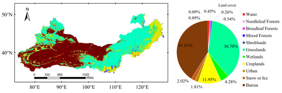 In this study, the Global Land Surface Satellite (GLASS) Gross Primary Production (GPP) and Evapotranspiration (ET) datasets from 2001 to 2017 with a spatial resolution of 0.05° and a temporal resolution of 8 days were adopted to calculate WUE. The GLASS GPP product was produced with a Bayesian multialgorithm integration method combining light use efficiency models and has been validated worldwide with high accuracy [43]. The GLASS ET product was produced by integrating five latent heat flux algorithms and AVHRR, MODIS, and MERRA reanalysis data with Bayesian algorithms [44]. To classify the underlying land cover types in the Three-North region, MODIS land cover data (MCD12C1) with a spatial resolution of 0.05° were selected. The MCD12C1 product has divided land cover into 17 classes, as shown in Figure 2. The major land cover types in this region are barren land (41.01%) and grasslands (36.70%). To quantify the influences of nature and human activities, meteorological data (temperature and precipitation) developed by Peng et al. [45] with a spatial resolution of 0.5’ were used to calculate natural contributions.