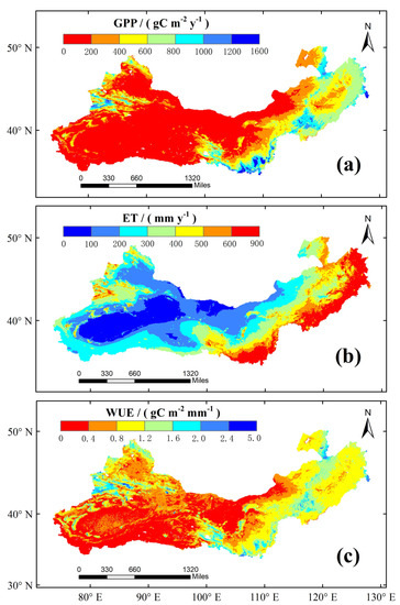 3.1. Spatial Distributions of GPP, ET, and WUE