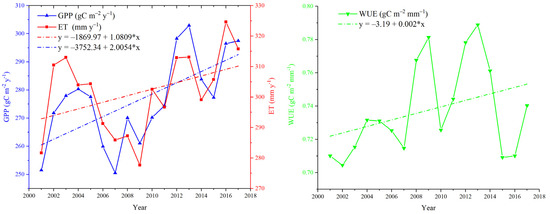 Overall temporal variations in GPP, ET, and WUE of the Three-North region of China.