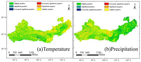 The spatial distributions of the t-test analysis of the correlation results between WUE and climate factors (annual precipitation and annual average temperature) are shown in Figure 8. In the northern and eastern parts of the Three-North region, WUE mainly showed a negative correlation with temperature. A positive correlation with temperature mainly occurred in the western and southwestern parts. These results suggested that in eastern parts of Three-North region, the increase of temperature may both increase GPP and ET, but the net effects in WUE was negative, while in western parts, the increase of temperature (usually with increase of temperature) would slightly increase WUE. The statistics showed that 53.61% of the total area had positive correlations between WUE and temperature, with 3.19% and 0.91% of the total area showing significant (p < 0.05) and extremely significant positive correlations (p < 0.01). Only 1.66% and 0.45% of the total area showed significant (p < 0.05) and extremely significant negative correlations (p < 0.01). For precipitation, the western parts of the Three-North region mainly showed negative correlations between precipitation and WUE, while the eastern parts mainly showed positive correlations, as shown in Figure 8b. A total of 44.13% of the total area showed positive correlations between precipitation and WUE, with 2.29% and 0.63% of the total area showing significant (p < 0.05) and extremely significant (p < 0.05) positive correlations, respectively. A total of 4.36% and 1.5% of the total area showed significant (p < 0.05) and extremely significant (p < 0.05) negative correlations, respectively, between WUE and precipitation. The spatial distribution pattern of correlations between precipitation and WUE suggested that the increase of precipitation in eastern parts will significant increase WUE, while in western parts, the effects are complex.