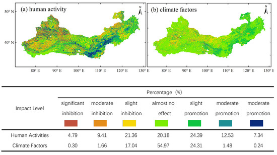 where is the contribution of climate factors, and and are the precipitation and temperature, respectively. , , and are regression coefficients, and is the contribution of human activities. To evaluate the impacts of climate factors and human activities, the Sen slopes of and are calculated to divide their impact into seven grades, as shown in Table 1: significant inhibition, moderate inhibition, slight inhibition, almost no effect, slight promotion, moderate promotion, and moderate promotion.