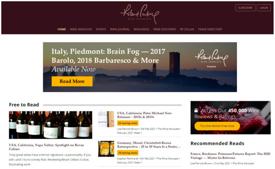 - The Wine Advocate. Available online: https://www.robertparker.com/ (accessed on 20 April 2021).