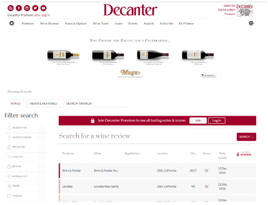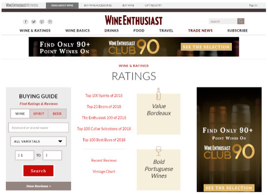 Wine Enthusiast Magazine was first published in 1988 as a guide to the latest wine trends, ratings and reviews, food and travel, award-winning commentary, and more. It was conceived and executed by a team of editors based in New York, California, Washington, France, England, and Italy (Figure 3). This website insists that while each editor offers a unique set of expertise, personality, and perspective to the Wine Enthusiast team, the editors are all united by one mission: to taste, enjoy, and communicate their love of the best wines, spirits, and food in the world to readers in a fresh and accessible way [23]. They do not focus on wine only. Wine Enthusiast’s aim is to provide consumers with information on the world of wine and spirits, review hundreds of wines each month, and provide comprehensive coverage of wine and lifestyle topics peripheral to wine, such as entertainment, travel, restaurants, and notable sommeliers. The Wine Enthusiast is published 14 times a year. It is known that there are over 800,000 readers worldwide [24].