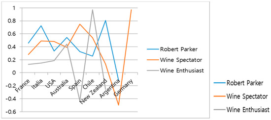 The ratings for wine quality of individual experts are collected from Robert Parker’s online site, www.Robertparker.com. The year the data set was collected is 2017, when Parker represents all the professional wine evaluations and content. Although the number of Robertparker.com’s wine reviewers was 10 at that time [20], its rating score was still regarded as an individual professional’s evaluation in the Korean market because Parker’s wine evaluation system has been well-known for being based on the individual professional’s wine-related intelligence [19]. In the case of Wine Spectator and Wine Enthusiast, because multiple wine ratings on a given item by vintage exist, the researchers used mode instead of an average for the wine ratings for a given wine item by vintage.