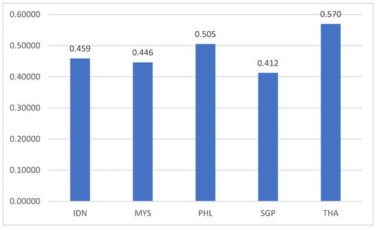 Figure 1 contains the information of the average score for the disclosures in each country. Thailand was the country with the highest average score for sustainability reports, with an average score of 0.570. The second highest score was the Philippines, with an average score of 0.505. Indonesia and Malaysia were the third and fourth countries, with average scores of 0.459 and 0.446. Singapore was, surprisingly, the country with the lowest average score, with an average score of only 0.412, even though Singapore’s high government indicators and GDP per capita are far superior to its neighboring countries. This might have been caused by the country’s industry sector, which is mostly focused on the financial sector, which was not included in this research.