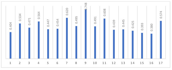 To be able to see which SDGs were most disclosed by the companies, Figure 2 shows the average score of disclosure for each SDG target. Based on Figure 2, Goal 16, “Peace, Justice, and Strong Institutions”, saw the fewest disclosures. This may have been caused by the nature of the goal, which is more directly related to public sectors. Meanwhile, Goal 9, “Industry, Innovation, and Infrastructure”, saw the most disclosures, as this goal is closely related to the private sector. In addition to the disclosure of Goal 9, other disclosures that were widely disclosed by companies (with a disclosure value above 0.5) were the disclosures of Goal 2, Zero Hunger; Goal 4, Quality of Education; Goal 7, Affordable and Clean Energy; Goal 11, Sustainable Cities and Communities; and Goal 17, Partnership for the Goals.