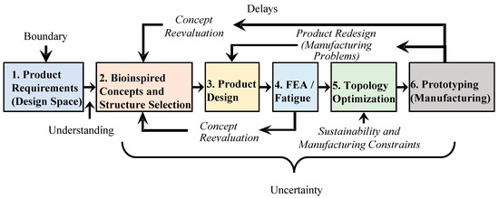 After topology is conducted the structure goes through prototyping and material structure testing in functional environments (Step 6). If the structure fails any testing or prototyping, a structure redesign or a concept reevaluation is required. However, these redesigns and reevaluations can be time consuming and create many delays in the system. The concept reevaluation goes back to the bioinspired concept selection and revisits candidate concepts that could achieve the same goal. Along with delays, there are also some uncertainties that should be considered when following this methodology. These uncertainties are embedded in every aspect of the design process. For example, in topology optimization there is uncertainty in the environment constraint definition in the modeling process versus the real material structure processing environment. Similarly, in the prototyping stage, there is quality inconsistency in manufactured structures and the tested 3D model. In addition, design engineers should also consider the potential delays in concept reevaluation, manufacturing prototypes, and problem identification. These delays usually hinder the design process and cause difficulties in completing the design.
