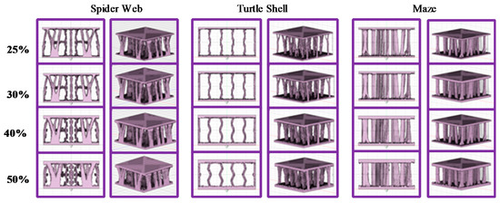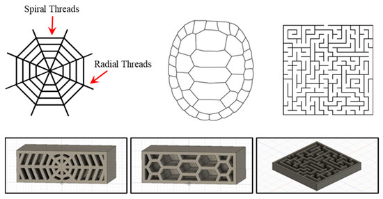 The final structure observed was designed based on a maze. Unlike the two previous structures which were designed horizontally, the maze structure was designed vertically. Figure 2 shows all three designed structures and shows that the spiderweb and turtle shell were designed from the back to the front of the structure, while the maze was designed from top to bottom. Having the maze developed in a vertical orientation could be beneficial when applying a force to the top of the structure. The maze used for this structure was designed with tight corridors to avoid any voids that could cause defects when a force is applied. Generally, mazes are generated by using specific algorithms and there are different algorithms for different types of mazes. The most common type of maze is a perfect maze, which contains no loops and allows the user to visit every location by simply following a wall [51]. It is important to note that maze structure is not a natural structure and identify that this structure is used to study the unnatural special structure compared to bioinspired structures.