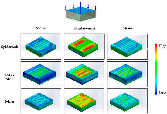 The results from the FEA are presented above, in Figure 3 and Table 3, and show how each structure was affected by applied forces. Note that the blocks in the figures represent the actual material structure design which has solid walls in the outside surface and designed geometries inside the block. Distributions of stress, displacement, and strain are shown in Figure 3, where red indicates positive values (shrinkage) and blue indicates negative values (expansion). Table 3 shows the absolute values of these variables. For the spiderweb, the areas under the most stress were located towards the center of the structure. This is a result of the force being applied to the top face and other surrounding areas failing due to deformation, causing the stress to be redistributed towards the center. The displacement of the spiderweb occurred in the areas left and right of the center. These areas were displaced the most because, unlike the center and walls of the structure, the material was not densely packed. Those two major displacements happened in the areas of the structure where many voids were present. The strain experienced by the spiderweb was very similar to its stress and for many of the same reasons. The turtle shell structure experienced the most stress around the areas of deformation. Like the spiderweb, stress was redistributed to these areas after sections failed due to deformation. These areas of deformation can most notably be seen through displacement and again, just like the spiderweb, the most displacement was seen on the turtle shell in areas of the structure where many voids were present. The turtle shell also experienced strain very similar to how it experienced stress. However, the maze produced results very different from the spiderweb and turtle shell. Stress for the maze was spread out over the top face, mainly occurring in areas where voids were not present. Compared to the two previous structures, displacement of the maze was more spread out with various areas of deformation. The strain experienced by the maze was also similar to the stress, like the two other structures. These differences when comparing the maze to the spiderweb and turtle shell can be explained by the orientation of the infill structure. The spiderweb and turtle shell infills were designed to run horizontally, which resulted in long voids that led to large amounts of displacement. The maze, however, was designed vertically, which more evenly distributed the force and led to less deformation.
