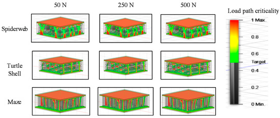 Figure 5 shows the optimized versions of each structure for each force value tested. The colored regions show the load path criticality value, which is a 0 to 1 variable, and represents the region in the model that is critical to resisting the applied load. All the structures displayed in the figure were also all set to have a remaining mass ratio of 30%. From these optimized structures, most of the exterior walls were almost completely removed. This varied depending on the structure, with the maze having all exterior walls removed, the turtle shell having most of its exterior walls removed, and the spiderweb having small areas of wall remaining near the base of the structure. One key finding from these tests was that no matter how large the applied force was, the generated optimized topology always stayed generally the same with little to no changes. Each version of every structure was nearly identical regardless of the force that was applied. This shows that the topology optimized structures were generated primarily from the location of the force rather than the size of the force.