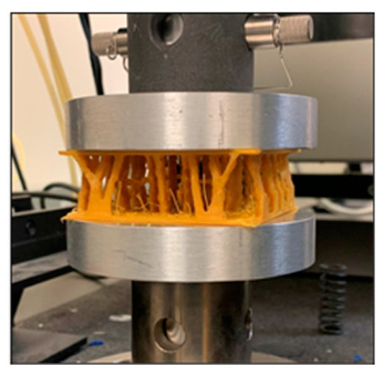 The testing parameters that were selected for the mechanical testing of these bioinspired structures were that of a maximum load of 25,000 N that was not to be exceeded. The platens would move at a speed of 6 mm per minute, and the platens would compress until reaching an extension of 15 mm from the top of the structure. The test proceeded until a value of 25,000 N was met or an extension value of 15 mm was achieved, whichever came first. All compression tests were conducted on a Instron Machine (Figure 6).