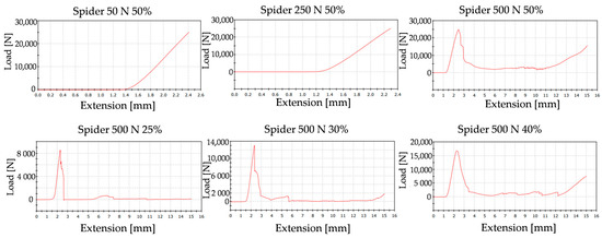 The spiderweb structures (Figure 8) behaved similarly to the turtle shell structures with some few variations (Figure 9b). The 50 N, 250 N, and 500 N at 50% all met structural failures at an extension of 2.3 mm to 2.4 mm. None of them exceeded the 25,000 N maximum load parameter and, therefore, all crashed. The 500 N structures at 25%, 30%, and 40% met a maximum load value of 1200 N, 1800 N, and 4200 N, respectively. It was noticed that the extension of the platens, in mm, has an exponential correlation with the amount of load, in N, that is experienced by the structures. For the four different 500 N load values (topology of 25%, 30%, 40%, 50%), the extensions were 1.5 mm, 1.6 mm, 1.9 mm, and 2.2 mm. These extension values corelate with maximum load values of 1200 N, 1800 N, 4200 N, and 10,000 N.