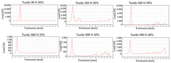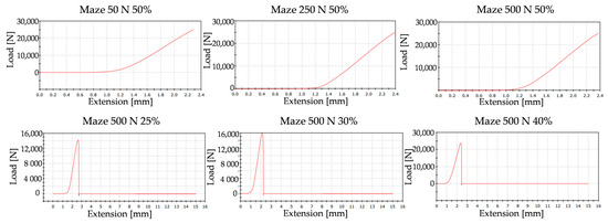 The maze structures (Figure 9c) behaved a little bit differently than the spiderweb and turtle shell structures in that all three of the 50% (50 N, 250 N, 500 N) exceeded the maximum load parameter of 25,000 N. The 500 N load values of 25%, 30%, and 40% structures had a maximum load value of 14,000 N, 16,000 N, and 23,000 N, respectively. It was also noticed during experimentation that the collapse or failure of the structure at the given maximum loads and extensions was particularly volatile and explosive. This can be seen in the graphs of the 500 N at 25%, 30%, and 40% structures. The graphs are unlike the other two structures in that, at the point of failure, the structure met near complete failure and there was no force detected throughout the rest of the extension of the platen. This can be seen in the results in Figure 10.