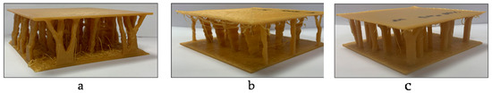Once topology optimization is conducted for each structure, the optimized variants are saved for printing. For this research, both the optimized and nonoptimized structures were printed using an Ultimaker 3 [55]. The machine used a 0.25 mm diameter nozzle, and the build volume was 230 × 190 × 200 mm3. The build speed was 24 mm3/s. The printer used standard 1.75 mm filament with dual print heads. One head was for PLA and the other head was for the support material, PVA. All parts were put into water to dissolve the PVA material. Thus, all the tested parts were made of PLA. The build speed was less than 24 mm3/s and the nozzle temperature was between 180–280 °C. The printer maximum power output was 350 W. The structures were printed bottom up, with an infill density of 100% and infill line distance of 0.4 mm, as shown in Figure 4 and Figure 5. Because the purpose of testing printed parts is to examine the manufacturing quality and the structure strength, it was tested through compression test.