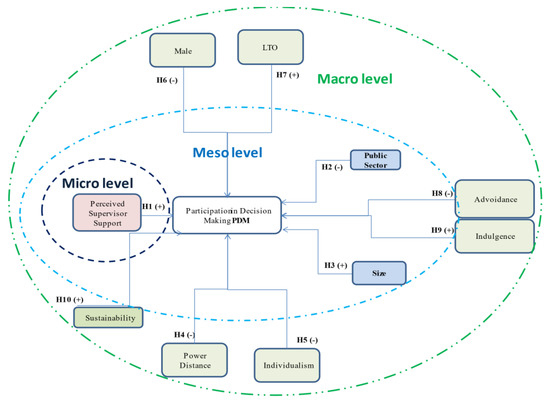 As commented in the introduction, the variable to be explained is the direct participation of the employee, at a general level, as well as distinguishing the scope of the decisions in which employees participate (operational and organizational) based on a range of variables at the micro (employee), meso (organization), and macro (cultural and sustainability indexes) levels. This structure per level could be visualized in Figure 1, which appears at the end of this section. The content of each of these variables is detailed below. Participative decision making (PDM) is the opportunity for an employee to provide input into the decision-making process related to work matters [46] (i.e., work organization, task priority) or organizational issues, for example, when they have a say on promoting new strategy ideas. Elele and Fields [47] state that PDM is a management initiative based on the ”theory Y”, which suggests that employees are interested in being committed and performing well if managers value their contributions in making decisions that affect the nature of work. The diverse opportunities to participate in the decision-making process can provide mutual benefits for employees and employers. Some writers have proposed that PDM enhances motivation [48,49], organizational commitment, and job satisfaction [50,51]. The literature frames employee participation in different contexts, depending on the political, social, and legal environment of the countries [52]. That is why other terms coexist with “employee participation” and are used similarly at the heart of PDM. These other terms include employee “voice”, “engagement”, “involvement”, or “empowerment”. Although there are some differences among these concepts [53,54,55], all share a common central point—to describe an environment in which employees can decide and act on what impacts their work and organizational decisions. According to [56], PDM is the same thing as employee involvement in decision making.
