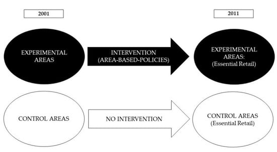26]. This will show the difference between the changes over time in the experimental areas and the changes over time in the control areas, allowing us to compare the two groups and understand the effects that are attributable to the projects. In addition, change trends are analyzed using repeat measurement models for each calculated indicator and in the different examined contexts. This will translate into understanding the extent to which the area-based public interventions implemented in Andalusia in recent decades have served essential retail businesses as a fundamental element in reducing urban vulnerability. It will also illustrate the need to take this into account when analyzing the structure of opportunity and basic resources of an individual. Therefore, the possible changes that have taken place will be analyzed first in order to focus on the extent to which these changes are due to the impact of the initiatives that have been carried out.