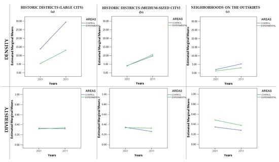 As highlighted in previous literature, however, it is necessary to control for possible the contextual effects on these results. In order to do this, we compared the change trends in the experimental and control areas with regard to the density and diversity of businesses, but on this occasion, we controlled for the possible effect of different contexts (the effect of interventions in the historic districts of large cities, medium-sized towns and cities, or neighborhoods on the outskirts) (see