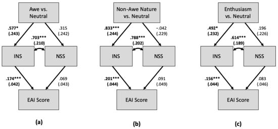 Results of lavaan path analyses illustrating unstandardized effects of emotion condition with mediation paths through INS and NSS: for (a) the Awe versus Neutral Control conditions; (b) the Non-Awe Nature versus Neutral Control conditions; (c) and the Appetitive Enthusiasm versus Neutral Control conditions. * p < 0.05; *** p < 0.001.
