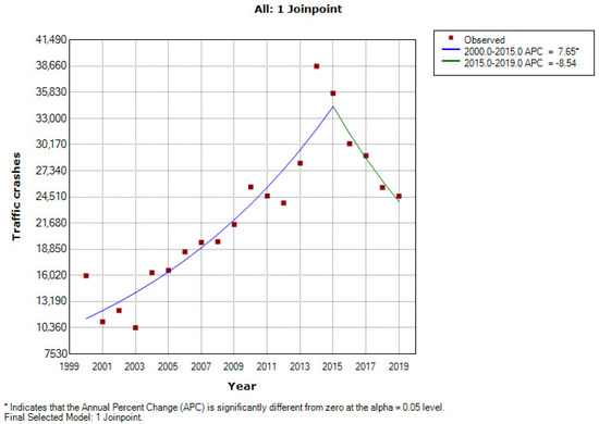 About the previous paragraphs, traffic accident data for Ecuador from 2000 to 2019 were analyzed. Regression analysis using Joinpoint software helps to identify the most significant changes in the period. See